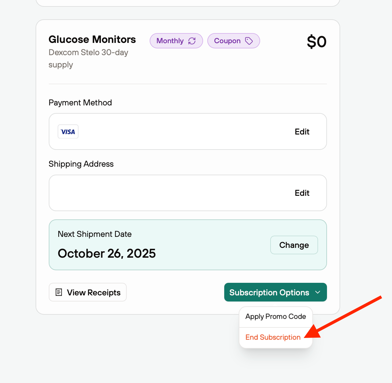 - Under the Glucose Monitors card, click the Subscription Options button.