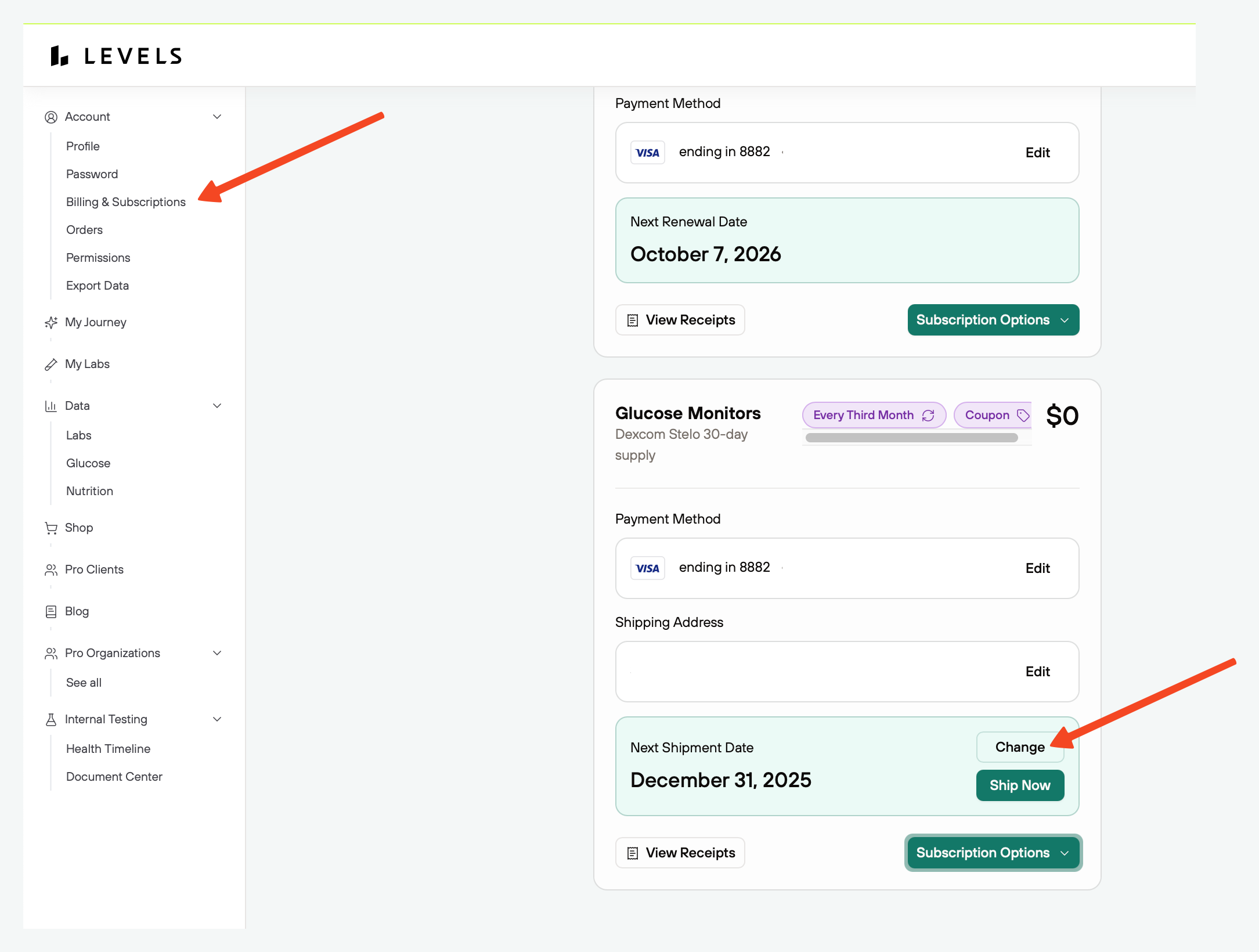Here's how to delay the next CGM shipment to a later date. Your next CGM subscription order can be delayed at any time before the next Levels Kit ships.