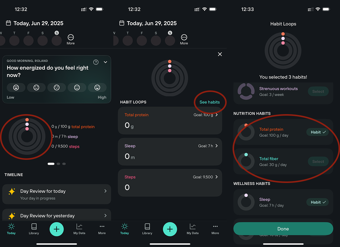 - 🥗 Total Fiber: Fiber plays key roles in gut health and blood sugar. Use this habit loop to track towards your daily fiber target.