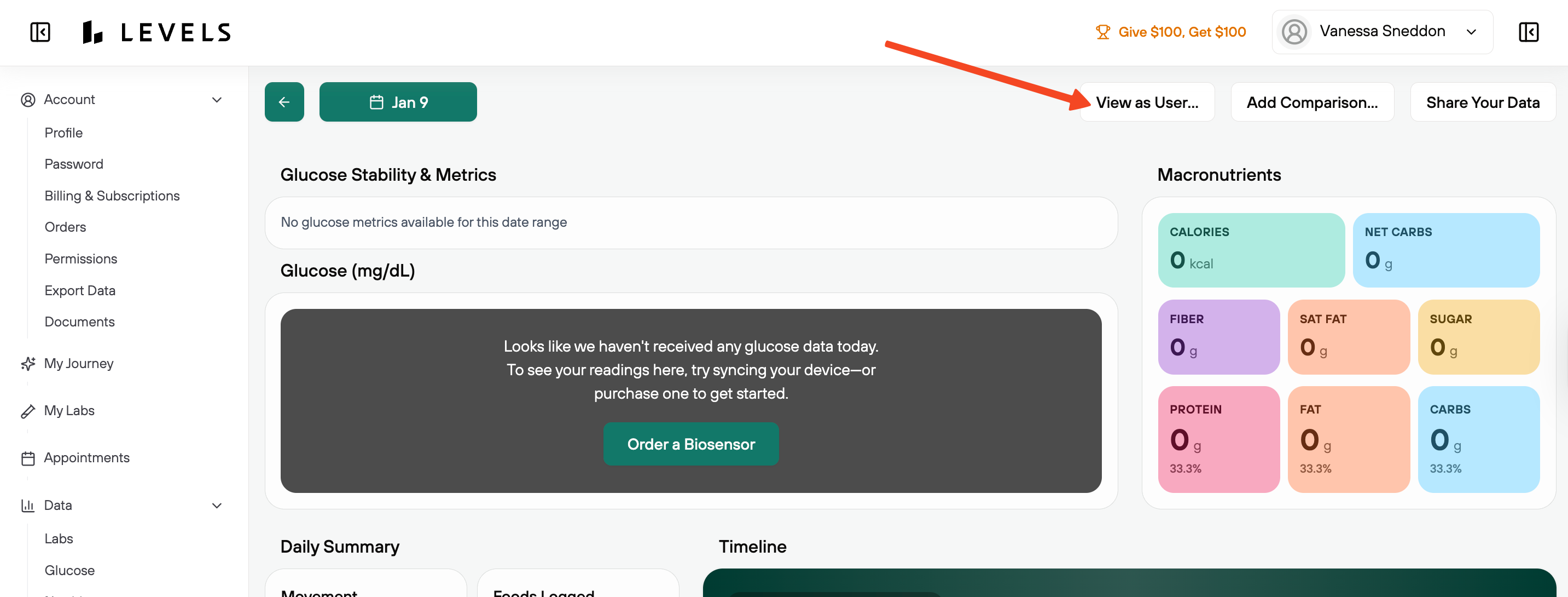 - If you are not a Levels user, ask the individual who's data you would like to see to share their Levels data with you via their Levels Dashboard. You will then receive an email where you can set up your Levels account.