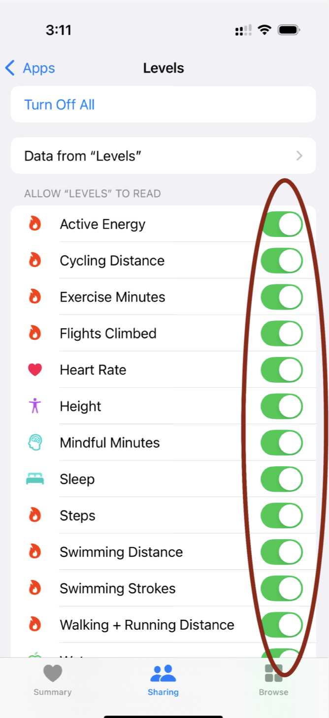 If you don't see a green checkmark next to this option, it means the connection is not currently established. Tap on the option and follow the prompts to reconnect Levels to your Health app.